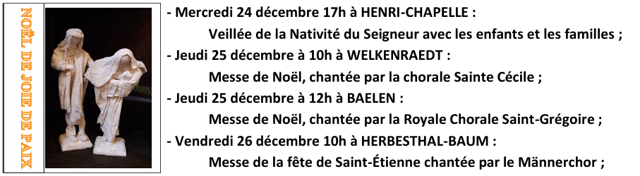 Ce samedi soir, nous entrons dans la veille du 3e dimanche de l’Avent. Je vous invite au rituel domestique autour de la couronne aux 4 bougies. Comme texte, nous prenons la première lecture du dimanche. Jésus lui-même prononcera cette prophétie dans la synagogue de Nazareth pour dire sa mission essentielle. Lecture du livre du prophète Isaïe 61,1s. : « L’esprit du Seigneur Dieu est sur moi parce que le Seigneur m’a consacré par l’onction. Il m’a envoyé annoncer la bonne nouvelle aux humbles, guérir ceux qui ont le cœur brisé, proclamer aux captifs leur délivrance, aux prisonniers leur libération, proclamer une année de bienfaits accordée par le Seigneur ».